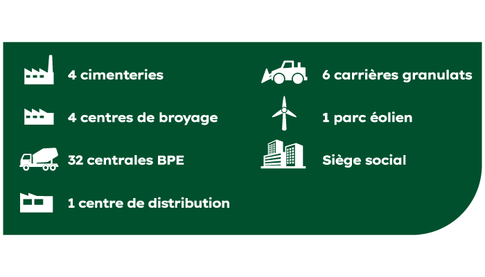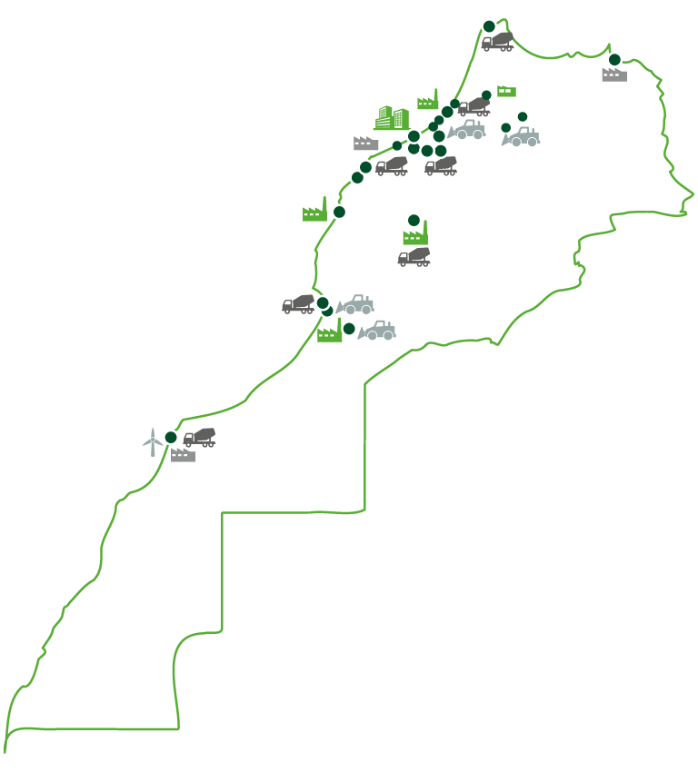 4 usines de ciment intégrées (Aït Baha–Agadir, Had Hrara–Safi, M’zoudia–Marrakech et Témara),